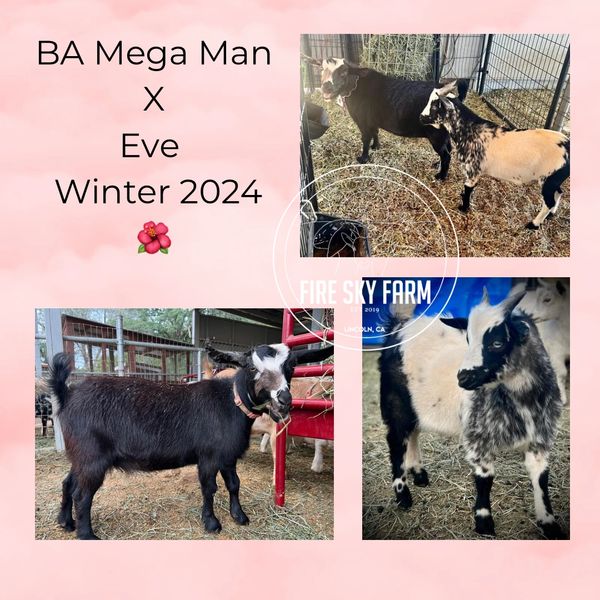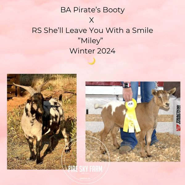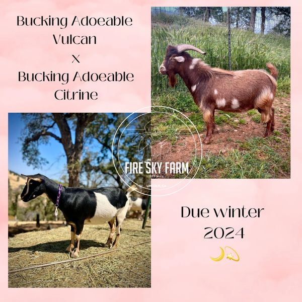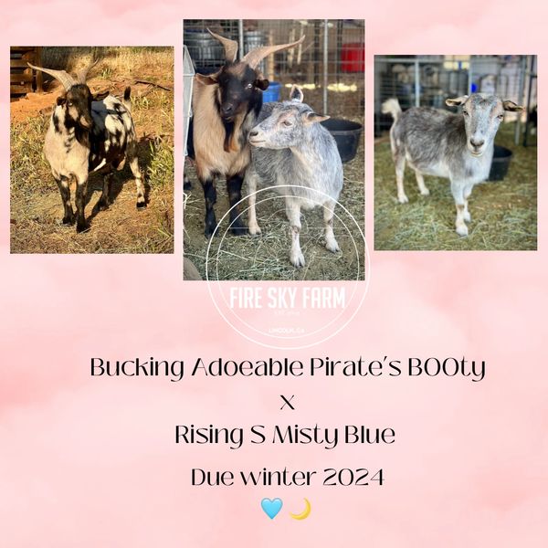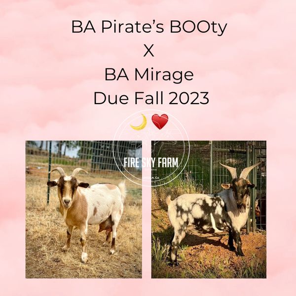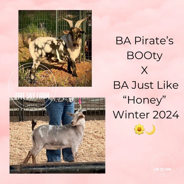 We’ve done a repeat breeding of Booty and Ember. Booty comes from micro/mini lines, put together very correct and is super flashy. Ember is short and stout. This girl has some good depth. Last season, their two doelings were in high demand! Their babies were covered from head to toe in moonspots and Swiss marked too!